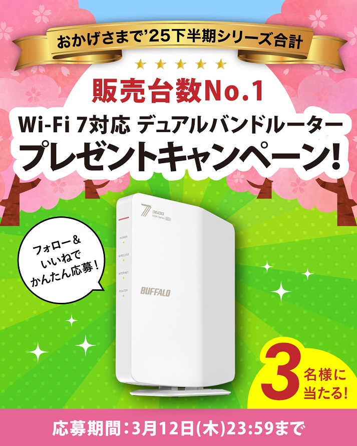 賞品:新生活にぴったりなWi-Fi 7入門モデル WSR3600BE4P-WH(3名様)