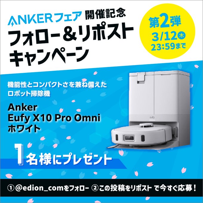 賞品:Anker ロボット掃除機 Eufy X10 Pro Omni ホワイト T2351521(1名様)