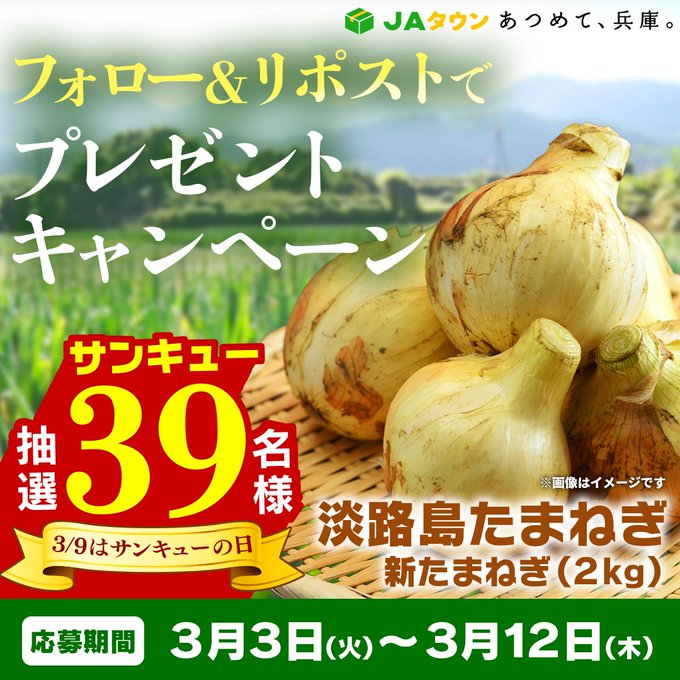 【X懸賞】淡路島たまねぎ2kgを39名様にプレゼント 2026.03.10JA全農兵庫‐フォロー&リポストキャンペーン 賞品:淡路島たまねぎ2kg(39名様) 締切:2026年3月12日(木)公式X(Twitter)アカウントをフォロー&キャンペーン対象ポストをリポストしてご応募ください。※詳細はキャンペーンページにてご確認ください。応募はこちらから