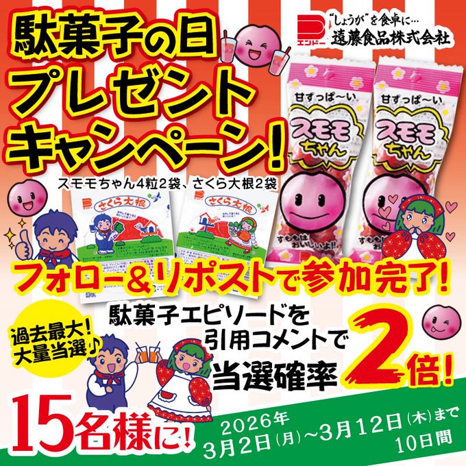 【X懸賞】駄菓子セットを15名様にプレゼント 2026.03.10さくら大根@遠藤食品‐#駄菓子の日 プレゼントキャンペーン 賞品:駄菓子セット(15名様) 締切:2026年3月12日(木)公式X(Twitter)アカウントをフォロー&キャンペーン対象ポストをリポストしてご応募ください。※詳細はキャンペーンページにてご確認ください。応募はこちらから