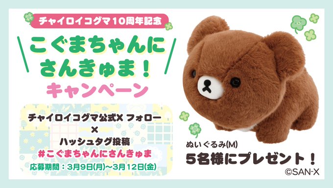 「#こぐまちゃんにさんきゅま」をつけて、チャイロイコグマの好きなところを投稿してくださった方の中から、抽選で5名様に「ぬいぐるみ(M)」をプレゼント