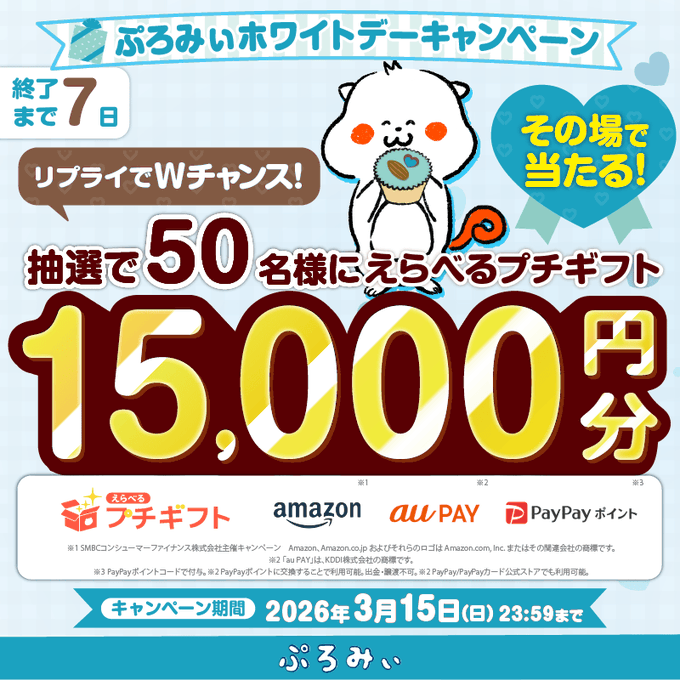 【毎日・X懸賞】えらべるプチギフト15,000円分が50名様にその場で当たる! 2026.03.11 2026.03.10ぷろみぃ‐ホワイトデーキャンペーン 賞品:えらべるプチギフト15,000円分(50名様) 締切:2026年3月15日(日)ぷろみぃ公式Xアカウントをフォロー&キャンペーン対象ポストをリポストしてご応募ください。※詳細はキャンペーンページにてご確認ください。応募はこちらから