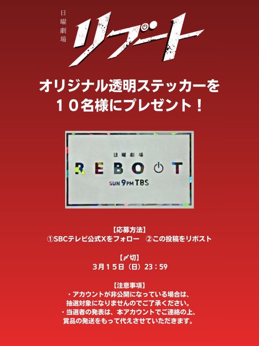 【X懸賞】日曜劇場『リブート』オリジナル透明ステッカーを3名様にプレゼント