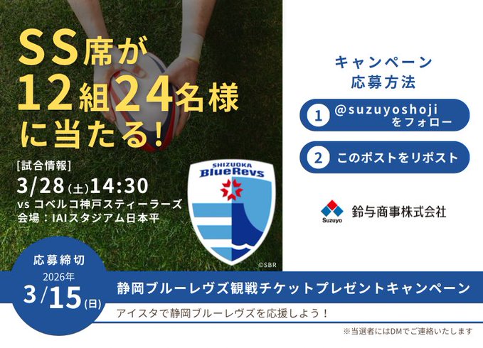 賞品:『静岡ブルーレヴズ vs コベルコ神戸スティーラーズ』の試合にご招待(12組24名様)
