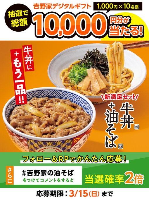 賞品:吉野家デジタルギフト1,000円分(10名様)