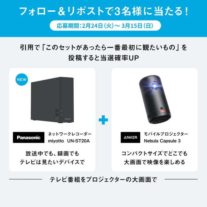 @Panasonic_cpと@Anker_JPをフォロー&キャンペーン対象ポストをリポストしてご応募ください。