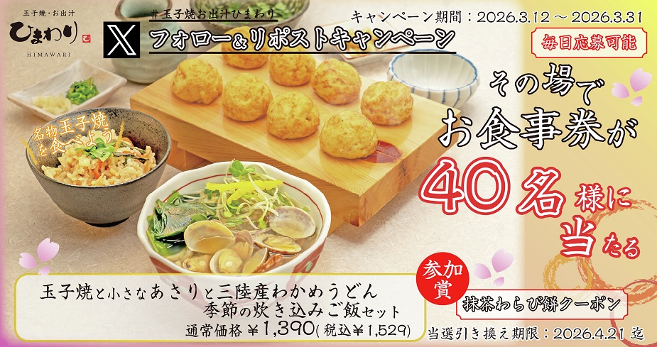 玉子焼・お出汁 ひまわり公式Xアカウントをフォロー&キャンペーン対象ポストをリポストして、記載されているURLからご応募ください。