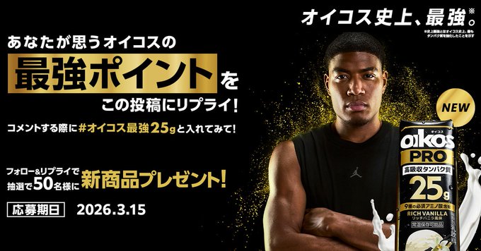 【X懸賞】PRO プロテインドリンク 1ケースを50名様にプレゼント 2026.03.14ダノンオイコス‐あなたが思う“オイコスの最強ポイント”を教えてください。 賞品:PRO プロテインドリンク 1ケース(50名様) 締切:2026年3月15日(日)① @oikos_JP をフォロー ② 投稿へリプライ※詳細はキャンペーンページにてご確認ください。応募はこちらから