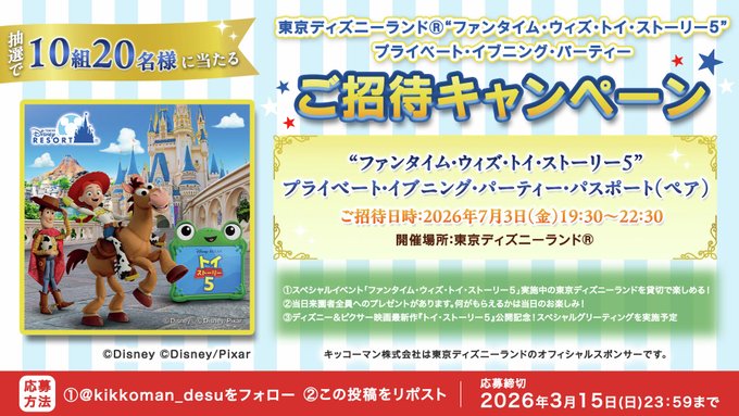 賞品:東京ディズニーランド®“ファンタイム・ウィズ・トイ・ストーリー5” プライベート・イブニング・パーティーご招待(10組20名様)