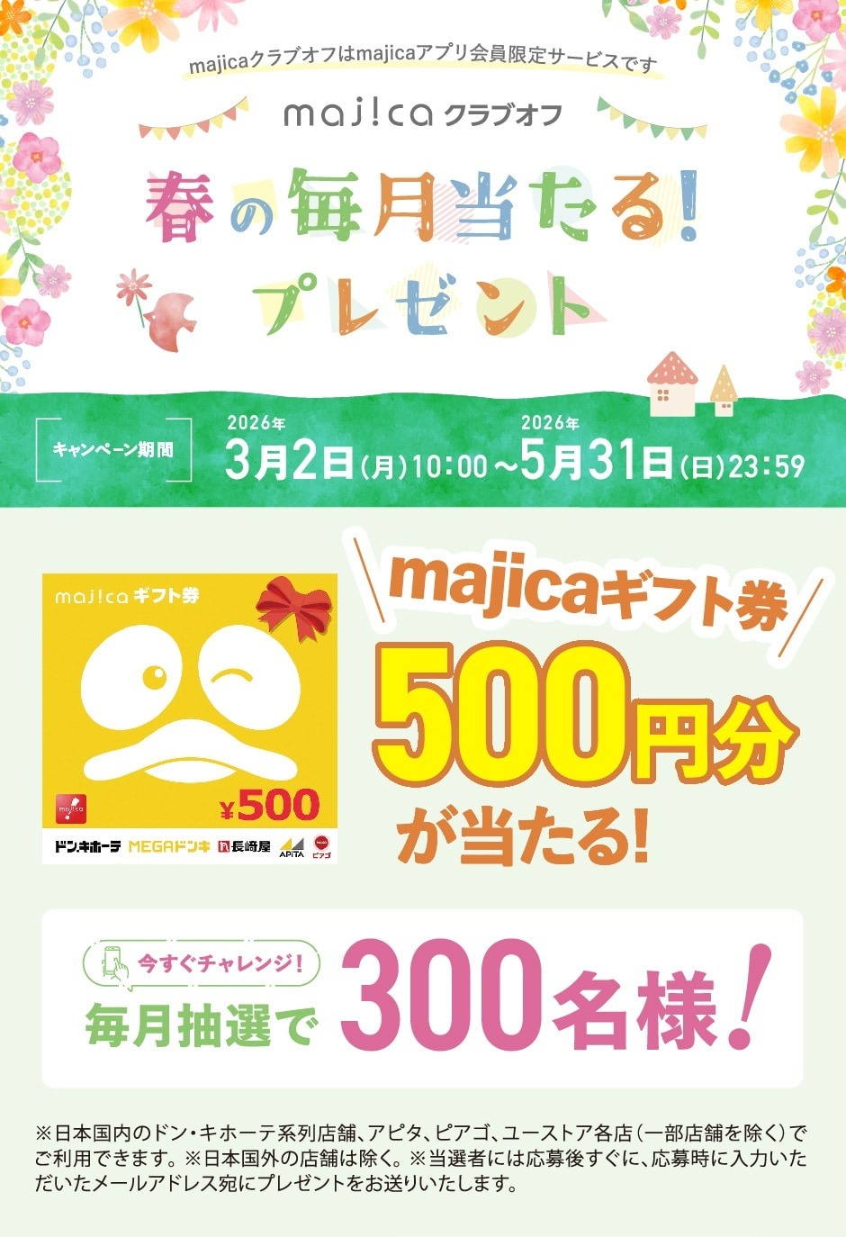 majicaクラブオフキャンペーン応募ページより応募いただくと毎月抽選で300名様に「majicaギフト券500円分」が当たります。