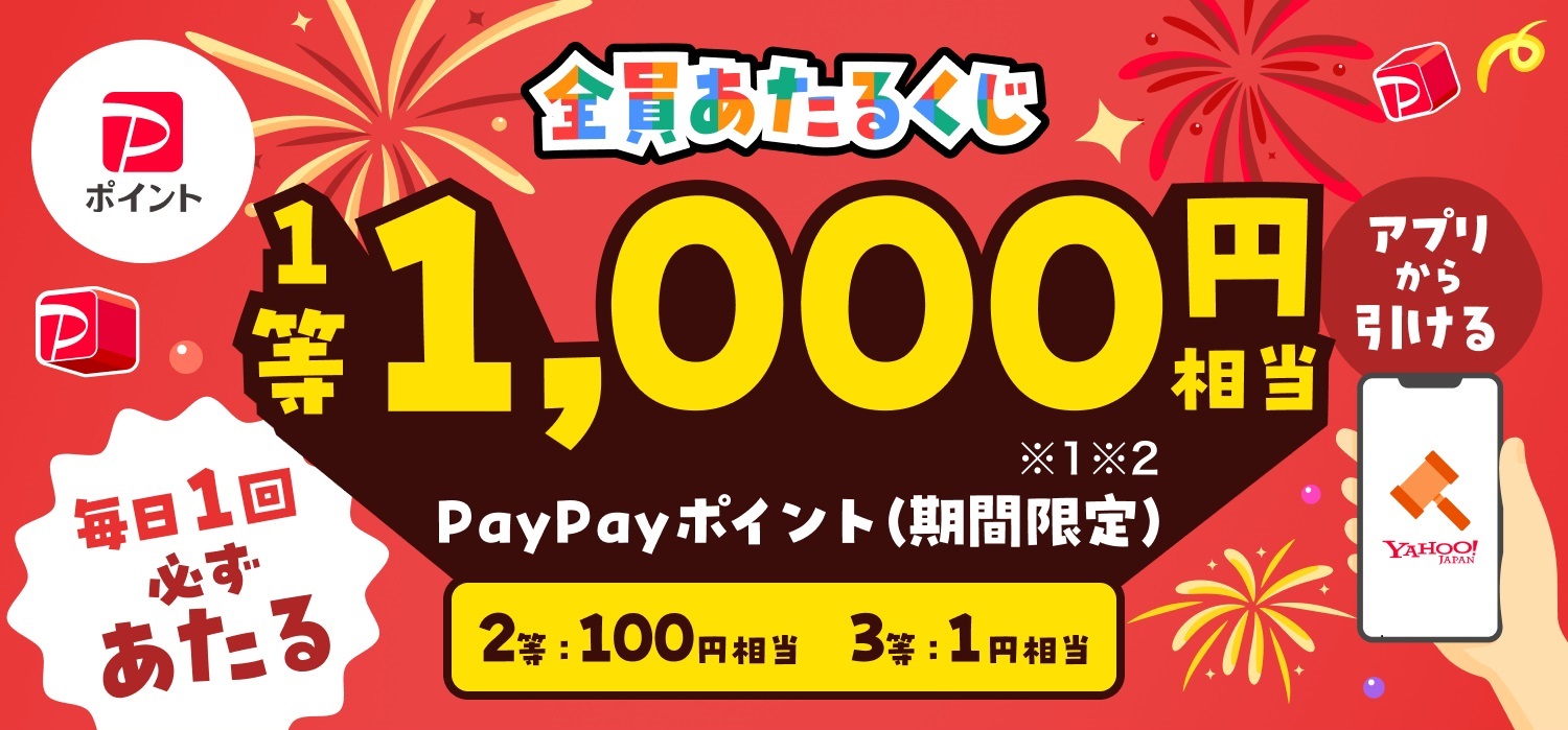 【毎日・アプリ】PayPayポイント最大1,000円相当がその場で当たる! 2026.04.02 2026.04.01Yahoo!オークション‐全員あたるくじ 賞品:PayPayポイント(期間限定)最大1,000円相当 締切:2026年4月30日(木)アプリ内からご応募ください。※詳細はキャンペーンページにてご確認ください。応募はこちらから