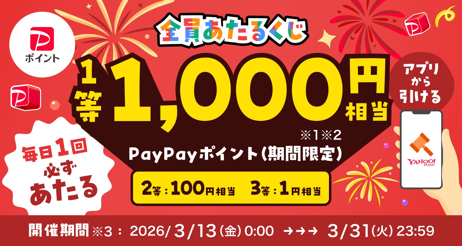 【毎日・アプリ】PayPayポイント最大1,000円相当がその場で当たる! 2026.03.14 2026.03.13Yahoo!オークション‐全員あたるくじ 賞品:PayPayポイント(期間限定)最大1,000円相当 締切:2026年3月31日(火)アプリ内からご応募ください。※詳細はキャンペーンページにてご確認ください。応募はこちらから