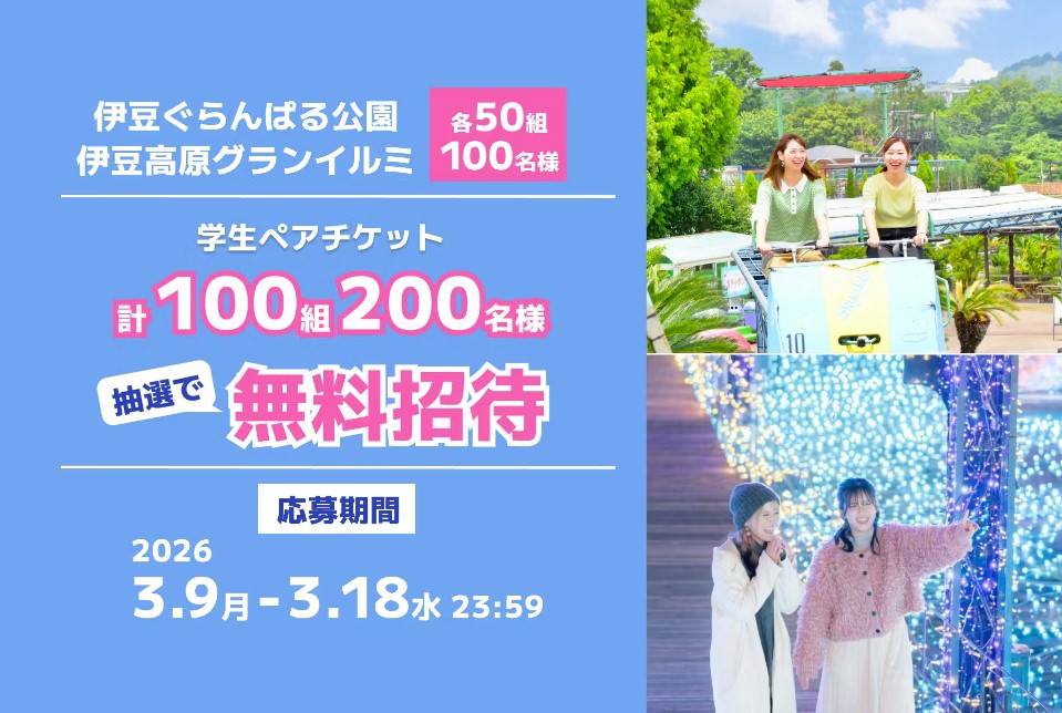賞品:伊豆ぐらんぱる公園 学生ペアチケット、伊豆高原グランイルミ 学生ペアチケット(100組200名様)