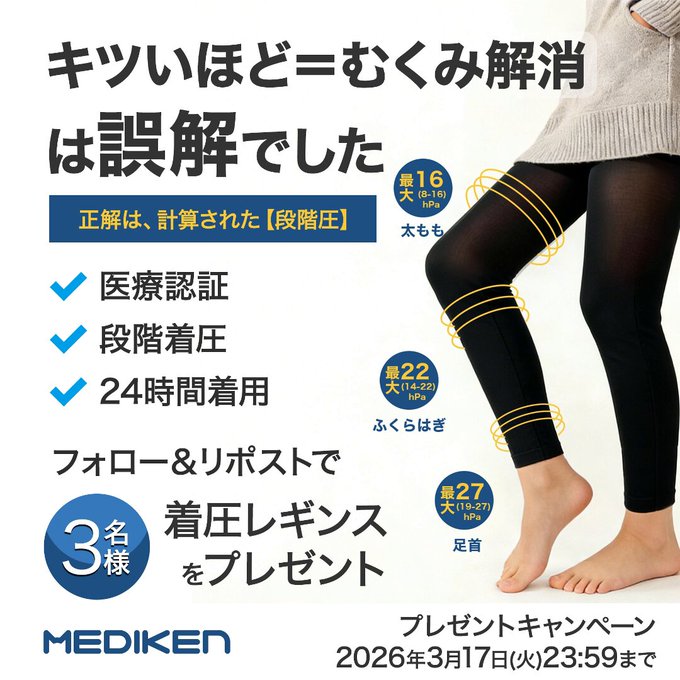 【X・Instagram懸賞】MEDIKEN 着圧レギンスを3名様にプレゼント 2026.03.15Mediken‐プレゼントキャンペーン 賞品:MEDIKEN 着圧レギンス(3名様) 締切:2026年3月17日(火)公式X(Twitter)アカウントをフォロー&キャンペーン対象ポストをリポストしてご応募ください。Instagramからも応募できます。※詳細はキャンペーンページにてご確認ください。応募はこちらから