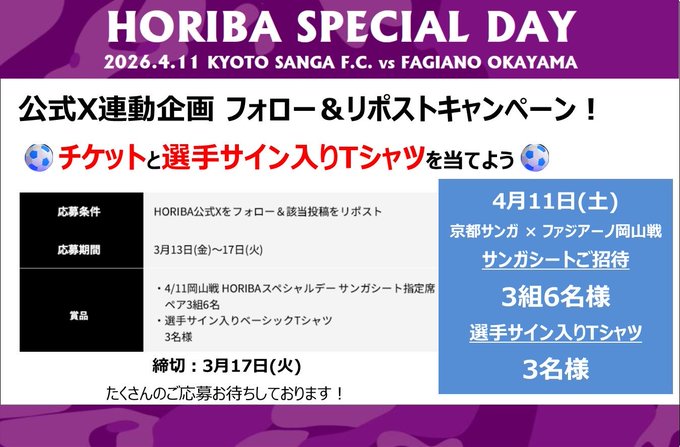 賞品:4/11 #京都サンガ x #ファジアーノ岡山 戦サンガシートペア、サイン入りTシャツ(3名様)