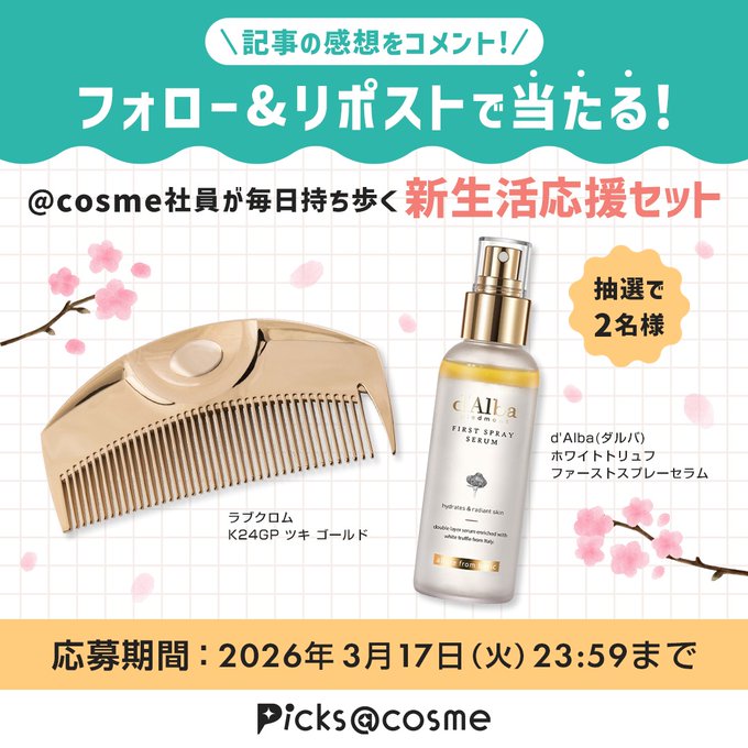 【X懸賞】新生活応援セットを2名様にプレゼント 2026.03.15アットコスメ‐フォロー&リポストキャンペーン 賞品:新生活応援セット(2名様) 締切:2026年3月17日(火)公式X(Twitter)アカウントをフォロー&キャンペーン対象ポストをリポストしてご応募ください。※詳細はキャンペーンページにてご確認ください。応募はこちらから