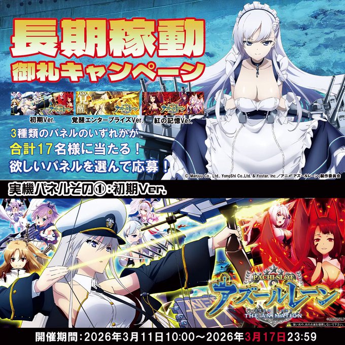 【X懸賞】L アズールレーン THE ANIMATION パネルを17名様にプレゼント 2026.03.15KYORAKU / 京楽産業.プレゼントキャンペーン 賞品:パネルのいずれか(合計17名様) 締切:2026年3月17日(火)応募方法 ❶@kyoraku_tanuをフォロー ❷希望するパネルを書いて引用リポスト※詳細はキャンペーンページにてご確認ください。応募はこちらから