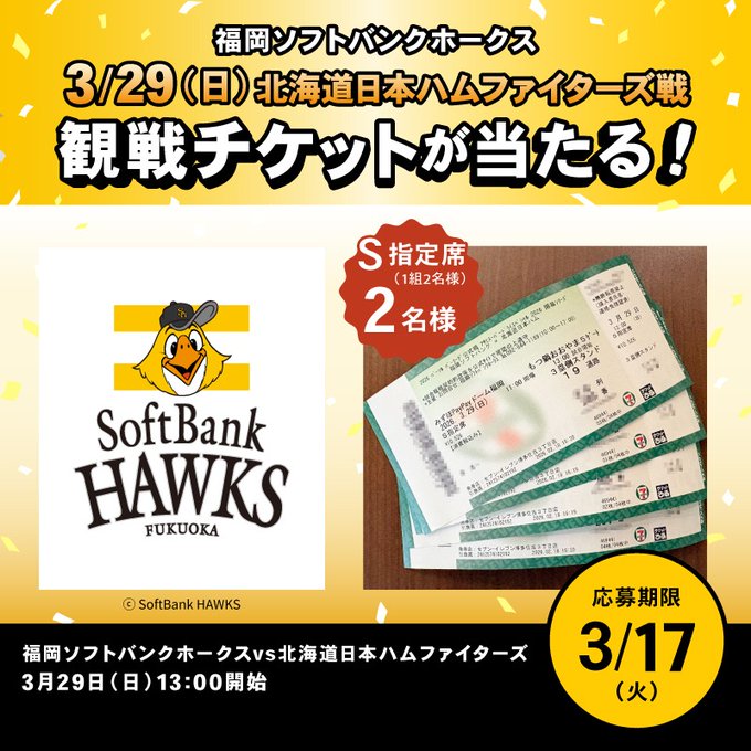 賞品:「3/29(日) vs北海道日本ハムファイターズ」の観戦チケット(2名様)