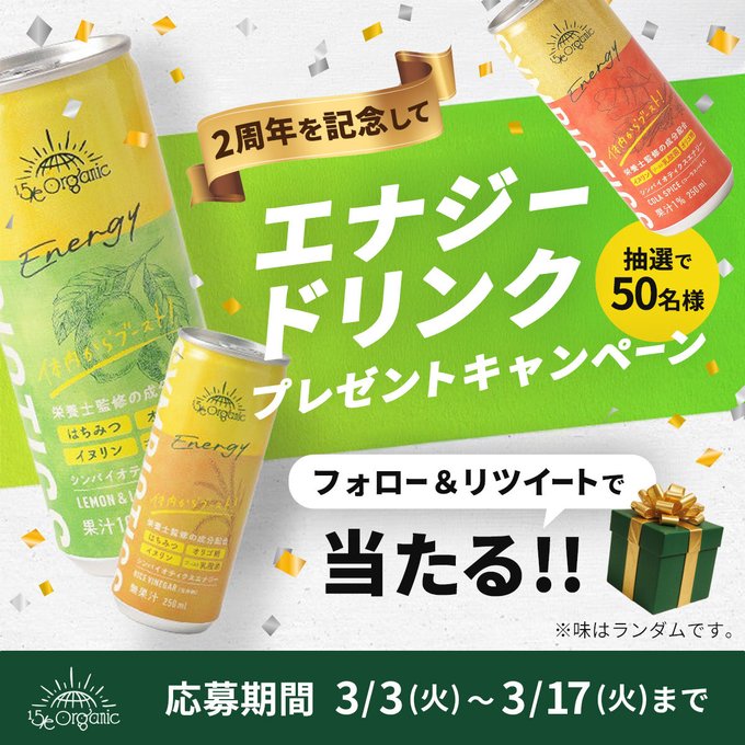 【X懸賞】エナジードリンクを50名様にプレゼント 2026.03.1515e_organic‐フォロー&リポストキャンペーン 賞品:エナジードリンク(50名様) 締切:2026年3月17日(火)公式X(Twitter)アカウントをフォロー&キャンペーン対象ポストをリポストしてご応募ください。※詳細はキャンペーンページにてご確認ください。応募はこちらから