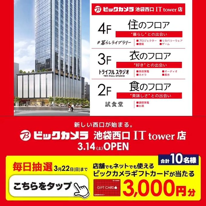 【毎日・X懸賞】ビックカメラギフトカード3,000円分が10名様にその場で当たる! 2026.03.15ビックカメラ‐フォロー&リポストキャンペーン 賞品:ギフトカード3,000円分(10名様) 締切:2026年3月22日(日)ビックカメラ公式Xアカウントをフォロー&キャンペーン対象ポストをリポストしてご応募ください。※詳細はキャンペーンページにてご確認ください。応募はこちらから