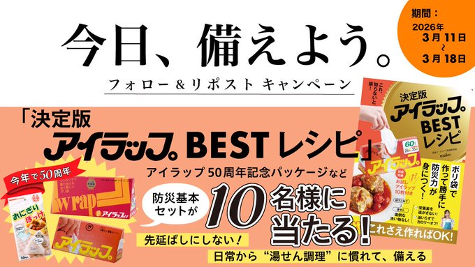 【X懸賞】防災に役立つグッズを10名様にプレゼント 2026.03.17アイラップ‐フォロー&リポストキャンペーン 賞品:防災に役立つグッズ(10名様) 締切:2026年3月18日(水)公式X(Twitter)アカウントをフォロー&キャンペーン対象ポストをリポストしてご応募ください。※詳細はキャンペーンページにてご確認ください。応募はこちらから