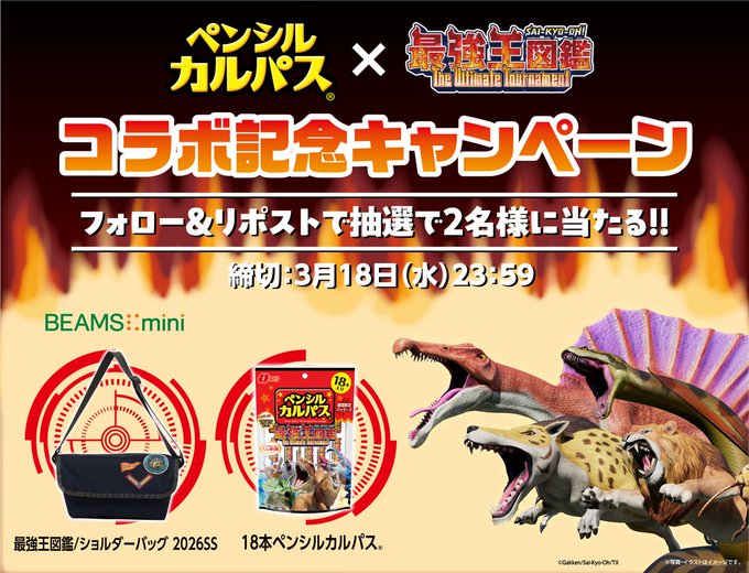 賞品:「18本ペンシルカルパス最強王図鑑コラボパッケージ」&「最強王図鑑/ショルダーバッグ 2026SS」(2名様)