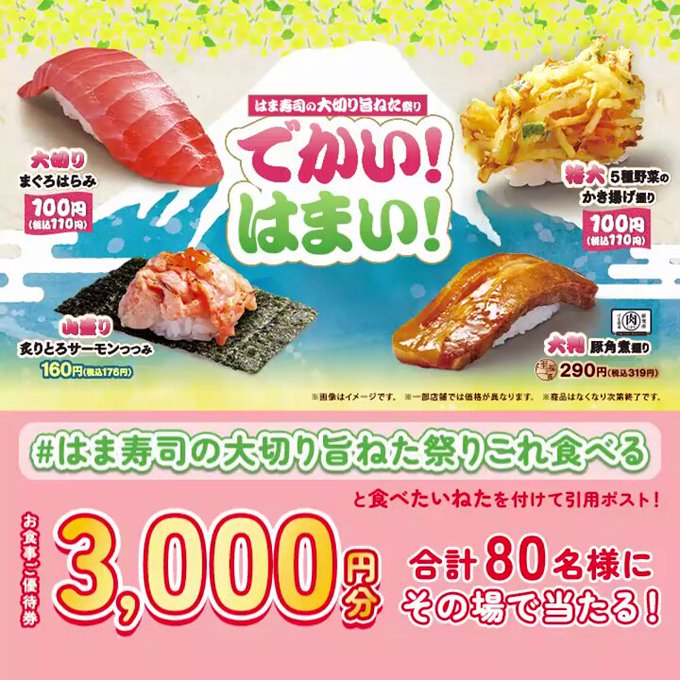 賞品:はま寿司で使えるお食事ご優待券3,000円分(80名様)