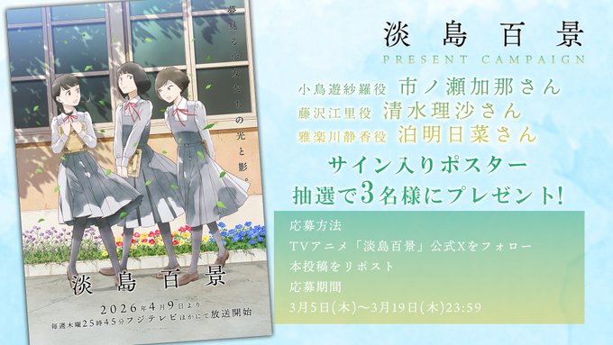 【X懸賞】TVアニメ「淡島百景」サイン入りポスターを3名様にプレゼント 2026.03.17TVアニメ「淡島百景」‐フォロー&リポストキャンペーン 賞品:サイン入りポスター(3名様) 締切:2026年3月19日(木)公式X(Twitter)アカウントをフォロー&キャンペーン対象ポストをリポストしてご応募ください。※詳細はキャンペーンページにてご確認ください。応募はこちらから