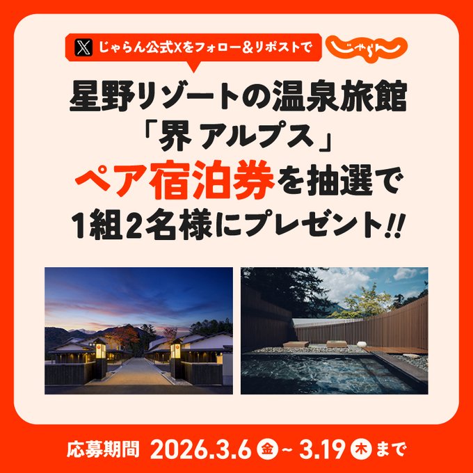 賞品:星野リゾート「界 アルプス」ペア宿泊券(1組2名様)