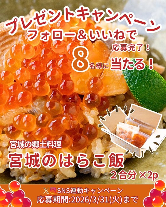 【X・Instagram懸賞】宮城のはらこ飯を8名様にプレゼント 2026.03.17気仙沼市ふるさと納税‐プレゼントキャンペーン 賞品:宮城のはらこ飯(8名様) 締切:2026年3月31日(火)応募方法 ・@kesennuma_numa をフォロー ・投稿にいいね!Instagramからも応募できます。※詳細はキャンペーンページにてご確認ください。応募はこちらから