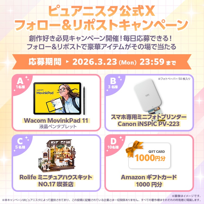 【毎日・X懸賞】液晶ペンタブレット、ミニフォトプリンター、本格DIYミニチュアハウスキット、Amazonギフト券1,000円分が合計19名様にその場で当たる!