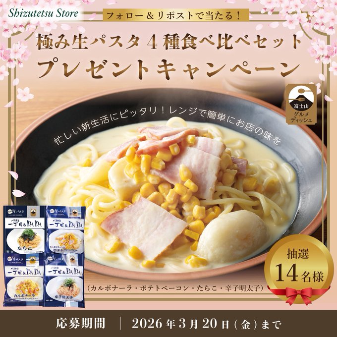 賞品:富士山グルメディッシュ「パスタ屋一丁目&DADA 極み生パスタ4種食べ比べセット」(14名様)
