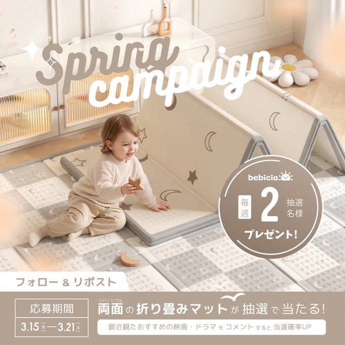 【X懸賞】両面の折り畳みマットを2名様にプレゼント 2026.03.19bebicia™︎‐春のプレゼントキャンペーン 賞品:両面の折り畳みマット(2名様) 締切:2026年3月21日(土)公式X(Twitter)アカウントをフォロー&キャンペーン対象ポストをリポストしてご応募ください。※詳細はキャンペーンページにてご確認ください。応募はこちらから