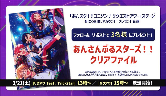 【X懸賞】クリアファイルを3名様にプレゼント 2026.03.19NICOGIRL‐フォロー&リポストキャンペーン 賞品:クリアファイル(3名様) 締切:2026年4月19日(日)公式X(Twitter)アカウントをフォロー&キャンペーン対象ポストをリポストしてご応募ください。※詳細はキャンペーンページにてご確認ください。応募はこちらから