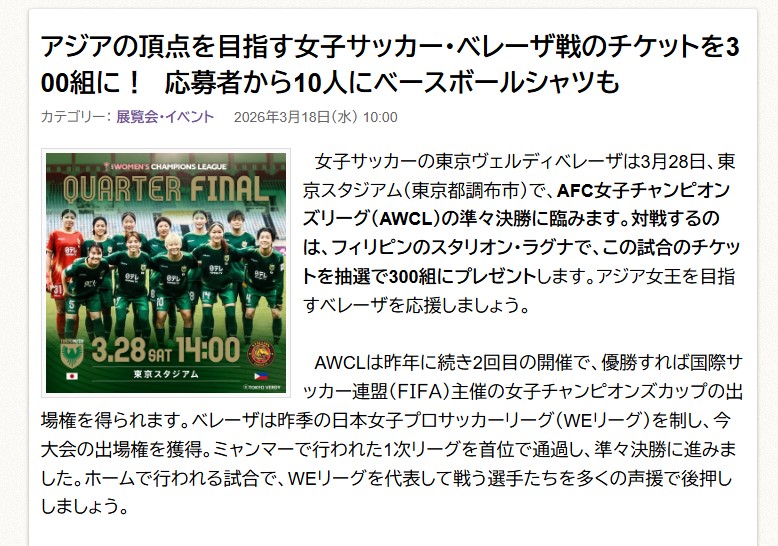 女子サッカー・ベレーザ戦のチケットを300組様にプレゼント 2026.03.19よみぽランド‐プレゼントキャンペーン 賞品:女子サッカー・ベレーザ戦のチケット(300組様) 締切:2026年3月23日(月)ご応募には会員登録/ログインが必要です。※詳細はキャンペーンページにてご確認ください。応募はこちらから