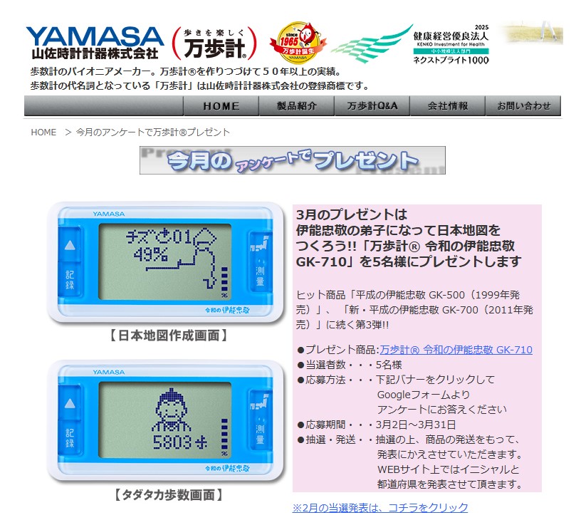 万歩計® 令和の伊能忠敬 GK-710を5名様にプレゼント 2026.03.19万歩計®の山佐(ヤマサ YAMASA)‐プレゼントキャンペーン 賞品:万歩計® 令和の伊能忠敬 GK-710(5名様) 締切:2026年3月31日(火)アンケートに答えてご応募ください。※詳細はキャンペーンページにてご確認ください。応募はこちらから