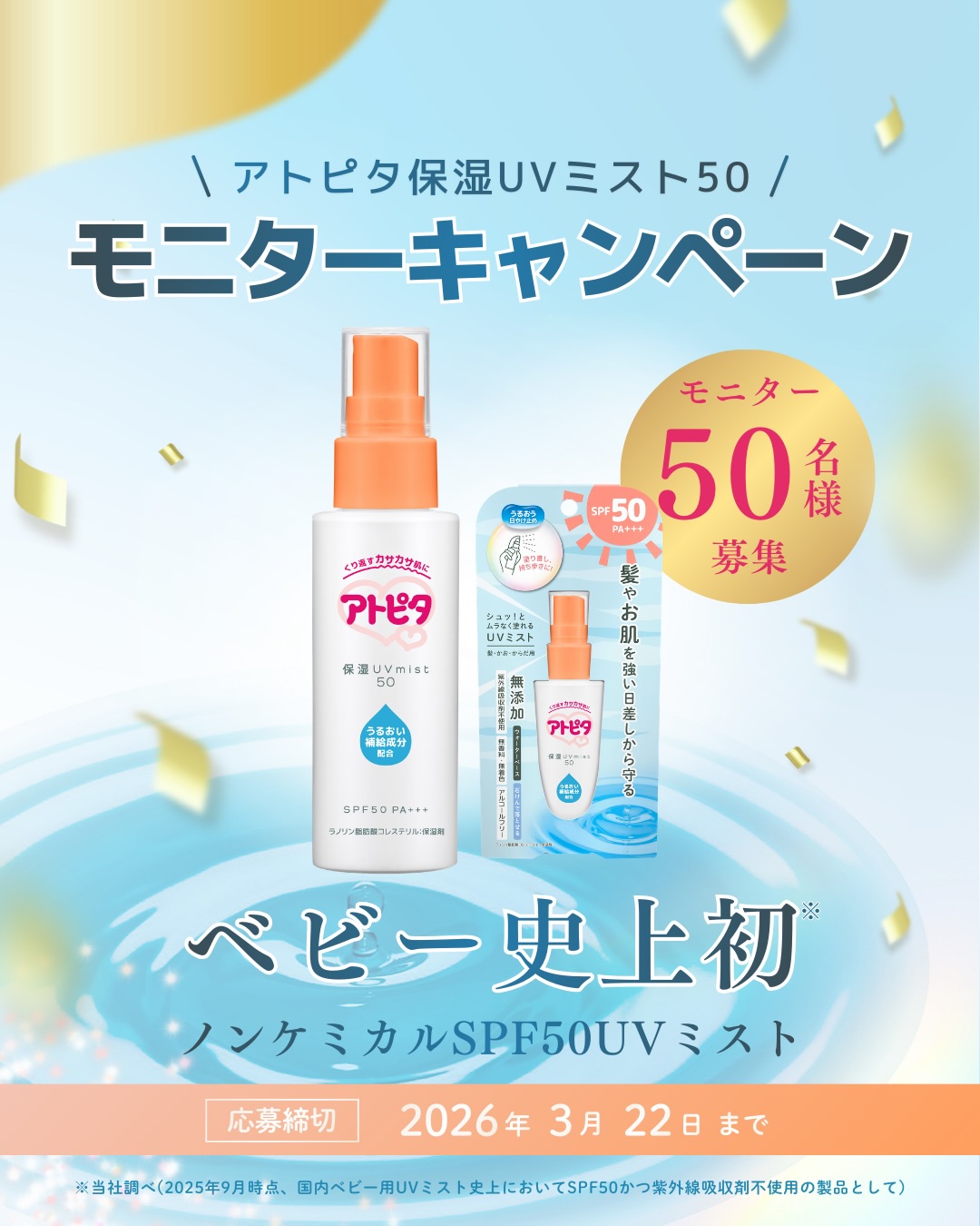 【Instagram懸賞】アトピタ保湿UVミスト50を50名様にプレゼント 2026.03.19アトピタ‐モニター50名様大募集 賞品:アトピタ保湿UVミスト50(50名様) 締切:2026年3月22日(日)応募方法: 1. 公式Instagramアカウントをフォロー 2. 対象の投稿に「いいね!」※詳細はキャンペーンページにてご確認ください。応募はこちらから