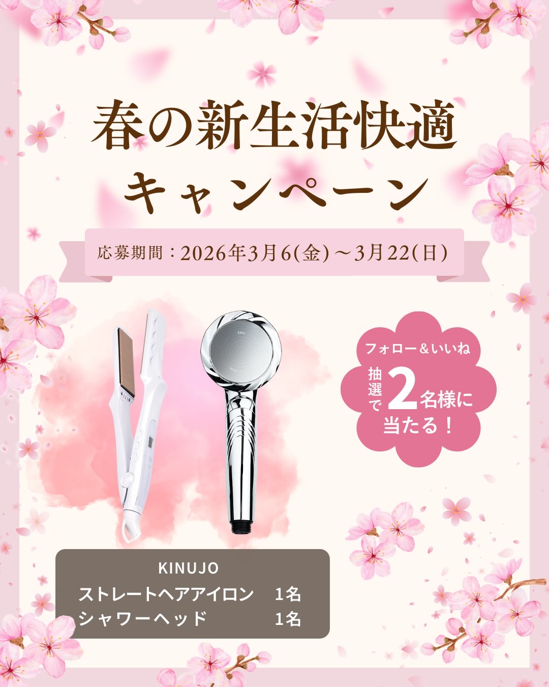 賞品:KINUJO ストレートアイロン、シャワーヘッド(2名様)