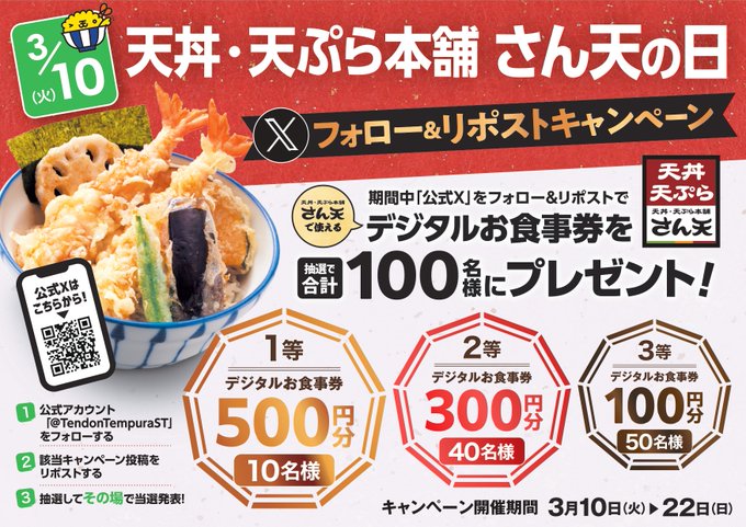 賞品:天丼・天ぷら本舗 さん天でご利用いただけるデジタルお食事券最大500円分(100名様)