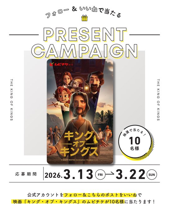 【X懸賞】映画『キング・オブ・キングス』ムビチケカードを10名様にプレゼント 2026.03.20キング・オブ・キングス‐プレゼントキャンペーン 賞品:映画『キング・オブ・キングス』ムビチケカード(10名様) 締切:2026年3月22日(日)① アカウントをフォロー ② 投稿にいいね※詳細はキャンペーンページにてご確認ください。応募はこちらから