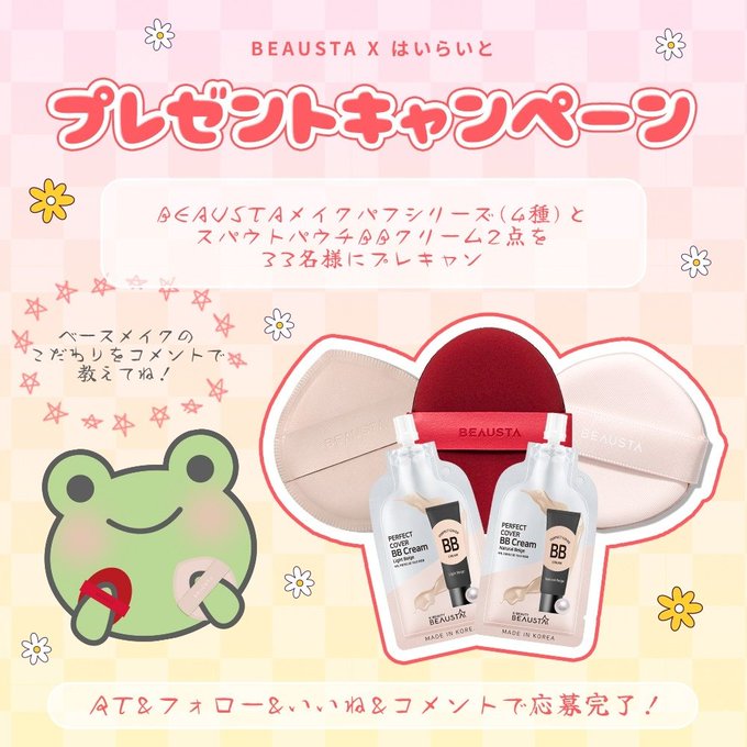 賞品:メイクパフシリーズ4種+パウチのBB クリーム(33名様)