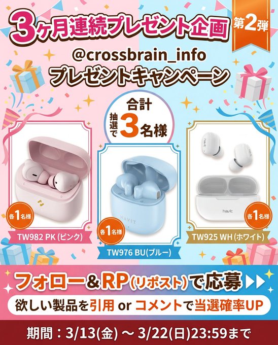 賞品:ワイヤレスイヤホン(3名様)