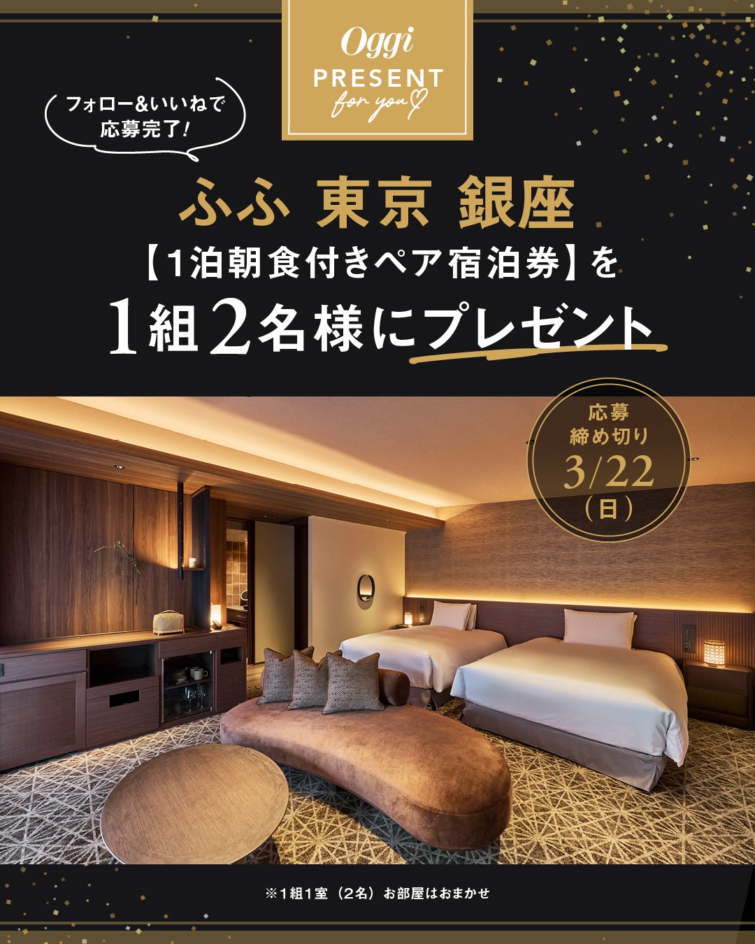 賞品:ふふ 東京 銀座 1泊朝食付きペア宿泊券(1組2名様)