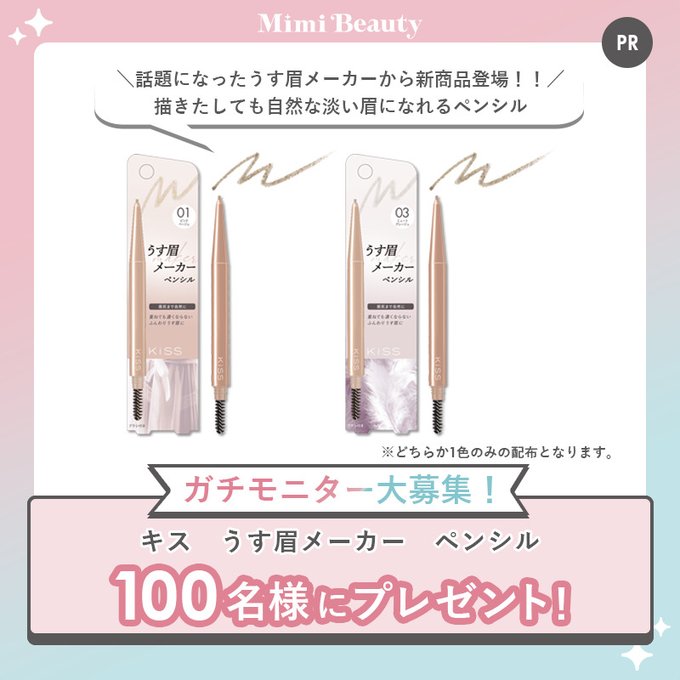 【X懸賞】キス うす眉メーカー ペンシルを100名様にプレゼント 2026.03.20Mimi Beauty‐ガチモニター企画 賞品:キス うす眉メーカー ペンシル(100名様) 締切:2026年3月22日(日)応募条件 ・商品体験頂ける方 ・公開のXアカウントをお持ちの方※詳細はキャンペーンページにてご確認ください。応募はこちらから