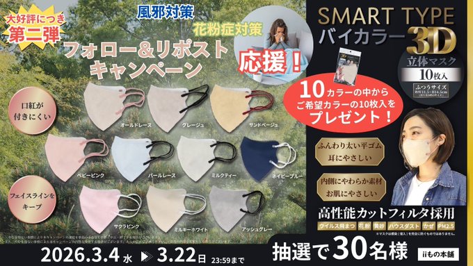 賞品:3D立体マスク スマートタイプバイカラー 10枚入(30名様)