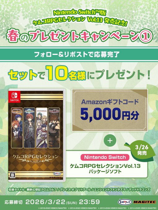 賞品:Switch版パッケージ「ケムコRPGセレクションVol.13」&Amazonギフトコード5,000円分(10名様)