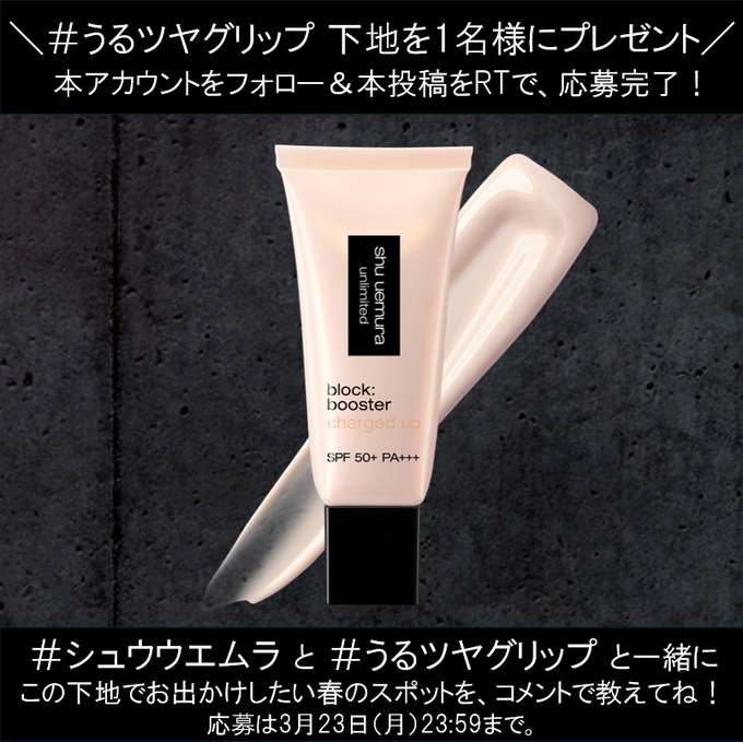 【X懸賞】シュウ ウエムラ うるツヤグリップ下地を1名様にプレゼント 2026.03.21シュウ ウエムラ‐フォロー&リポストキャンペーン 賞品:うるツヤグリップ下地(1名様) 締切:2026年3月23日(月)公式X(Twitter)アカウントをフォロー&キャンペーン対象ポストをリポストしてご応募ください。※詳細はキャンペーンページにてご確認ください。応募はこちらから