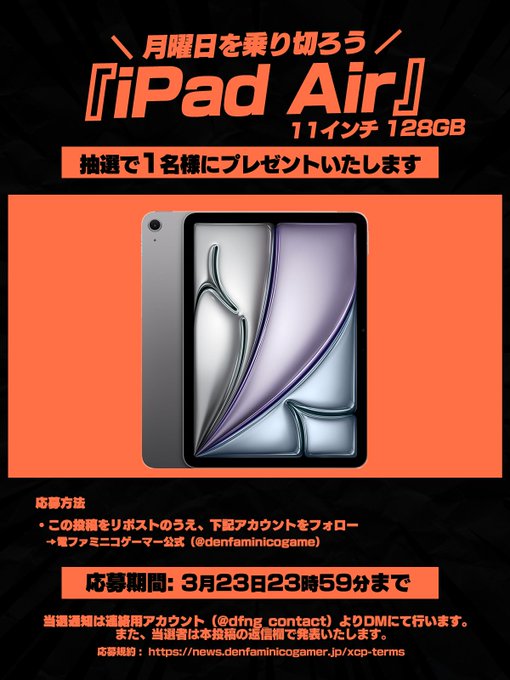 【X懸賞】iPad Air 128GBを1名様にプレゼント 2026.03.21電ファミニコゲーマー‐フォロー&リポストキャンペーン 賞品:iPad Air(1名様) 締切:2026年3月23日(月)公式X(Twitter)アカウントをフォロー&キャンペーン対象ポストをリポストしてご応募ください。※詳細はキャンペーンページにてご確認ください。応募はこちらから