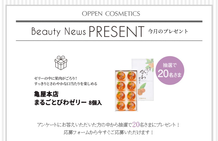 亀屋本店 まるごとびわゼリー 8個入を20名様にプレゼント 2026.03.21オッペン化粧品 Beauty News 今月のプレゼント 賞品:亀屋本店 まるごとびわゼリー 8個入(20名様) 締切:2026年5月20日(水)アンケートにお答えいただいた方の中から抽選で20名さまにプレゼント!※詳細はキャンペーンページにてご確認ください。応募はこちらから