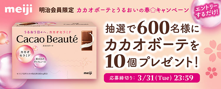 カカオボーテ10個セットを600名様にプレゼント 2026.03.21明治‐カカオボーテとうるおいの春キャンペーン 賞品:カカオボーテ10個セット(600名様) 締切:2026年3月31日(火)ご応募には会員登録/ログインが必要です。※詳細はキャンペーンページにてご確認ください。応募はこちらから